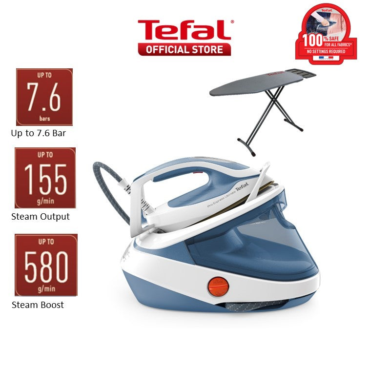 Tefal Pro Express Ultimate II Steam Generator with Ironing Board GV9710 - 2800W, up to 7.6 bar pressure, 580g/min steam boost, No burn - safe for all fabrics, Made in France